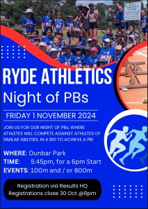 Ryde will be holding its first Night of PBs on Friday, 1 November, at Dunbar. The events on offer are the 100m and 800m. Athletes can nominate for events by logging into ResultsHQ and clicking on the Nominations tab. Nominations will close on Wednesday, 30 October, at 8pm.